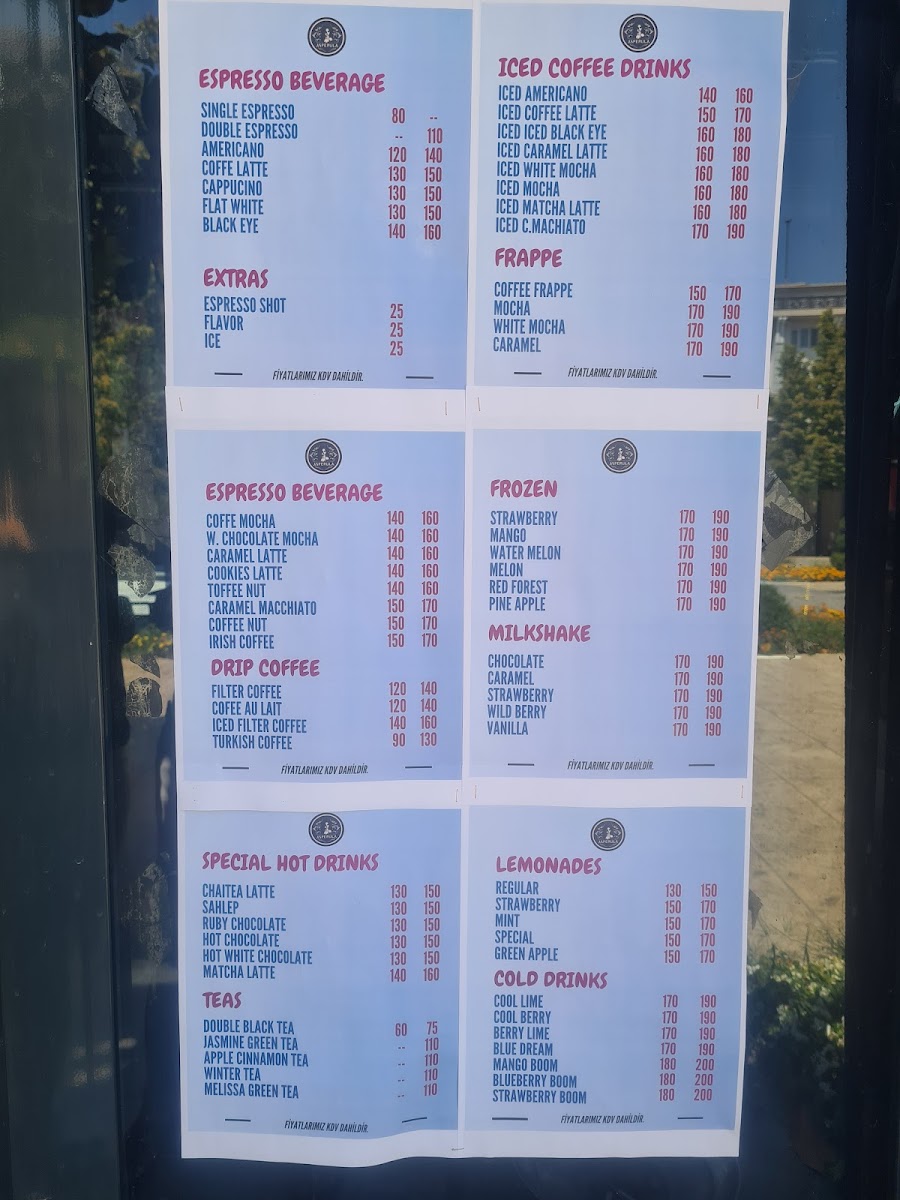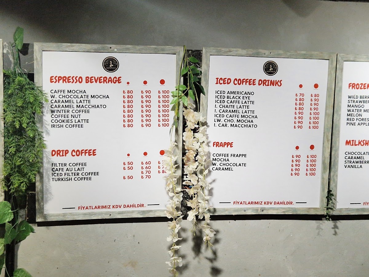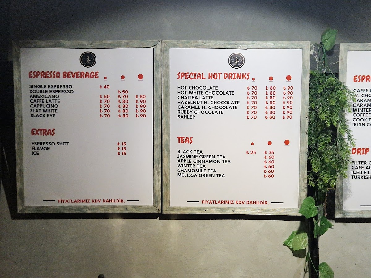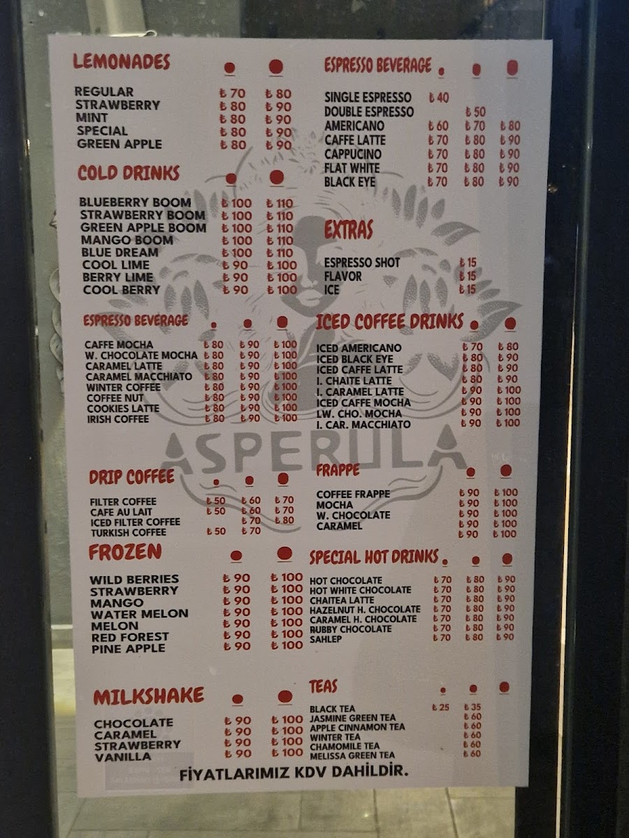 The menu at Asperula primarily features a variety of coffee and tea options, catering to those seeking a beverage for a coffee break or a casual visit. Alongside hot and cold drinks, the menu includes light food options such as cakes and pastries, with highlighted items like filtered coffee and chocolate cake noted by customers.